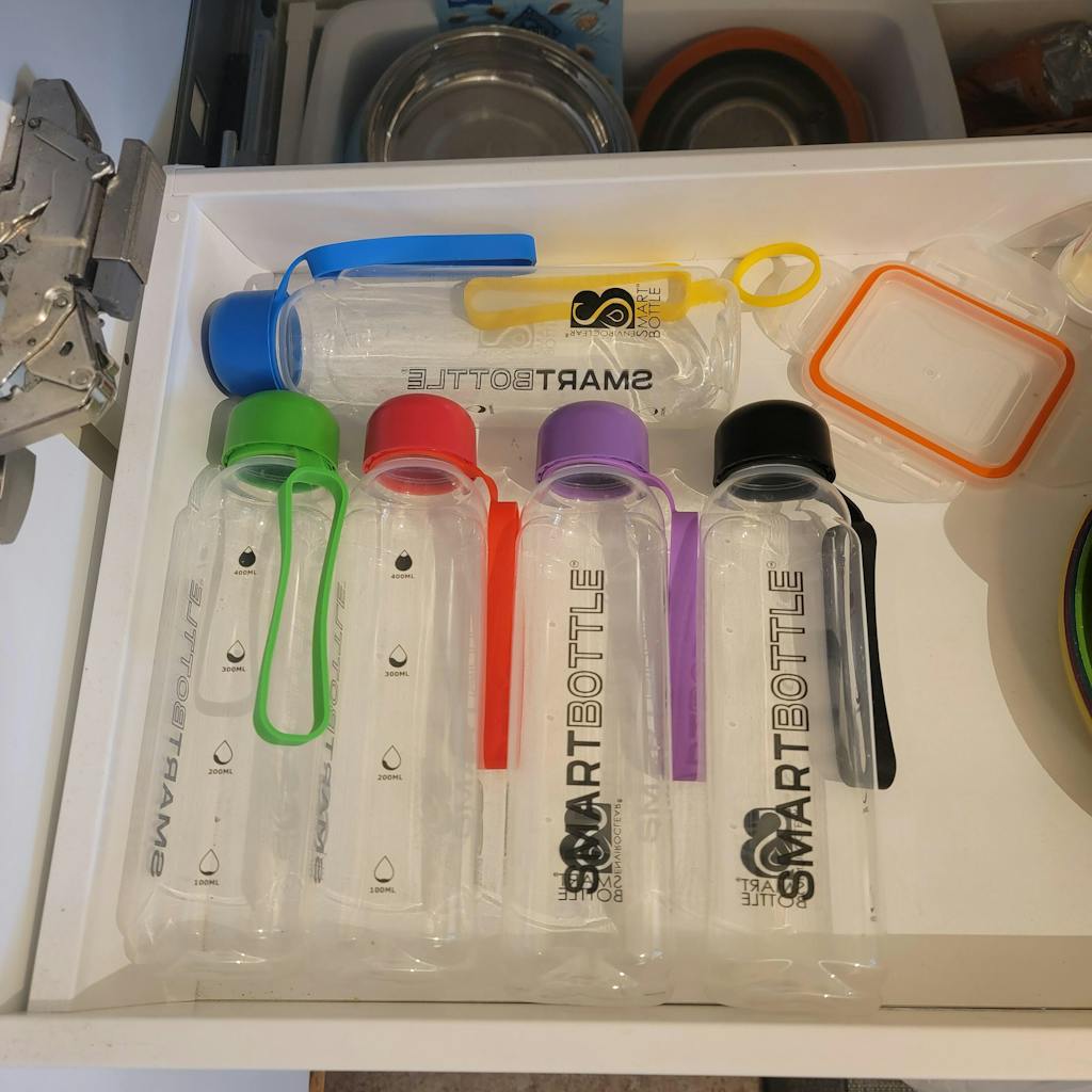 A professional organizer taught me that if you have multiple items (think food storage, water bottles, etc), you should have all the same type. I recently purchased 6 medium sized bottles and purged 2 full drawers of water bottles that we weren't using or were taking up too much space. I emailed SmartBottle and asked for six diff't bottle cap colors and they were more than happy to oblige. Really happy with SmartBottle!
